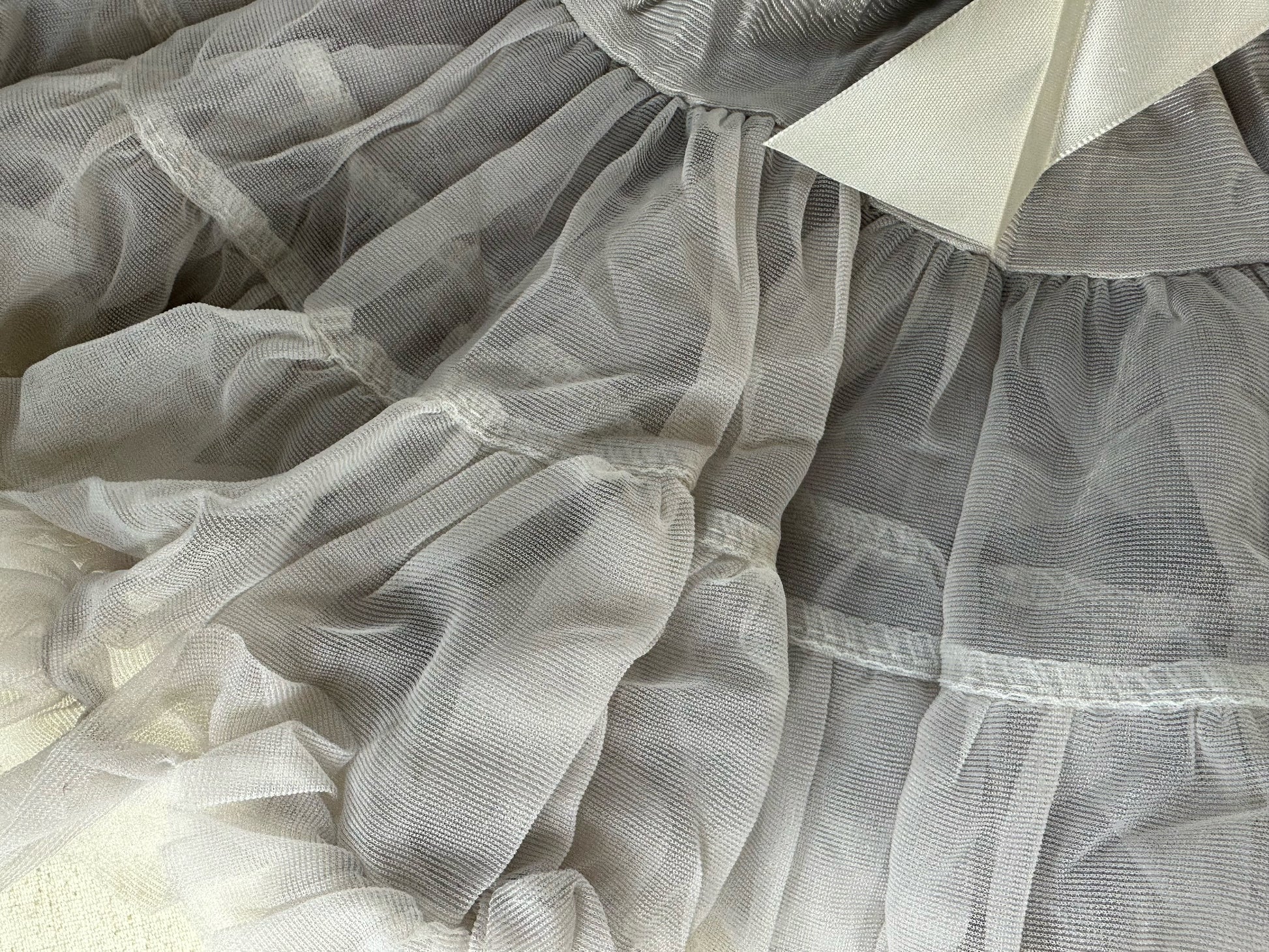 The fabric is anti-wrinkle, after you get the goods, Pls kindly hang for a while and it will resume to fluffy and flat soon. Many thanks. The skirt was made via 2 layers of tulle and 1 layer of lining. The fabric of the skirt is nylon which is soft and fluffy.