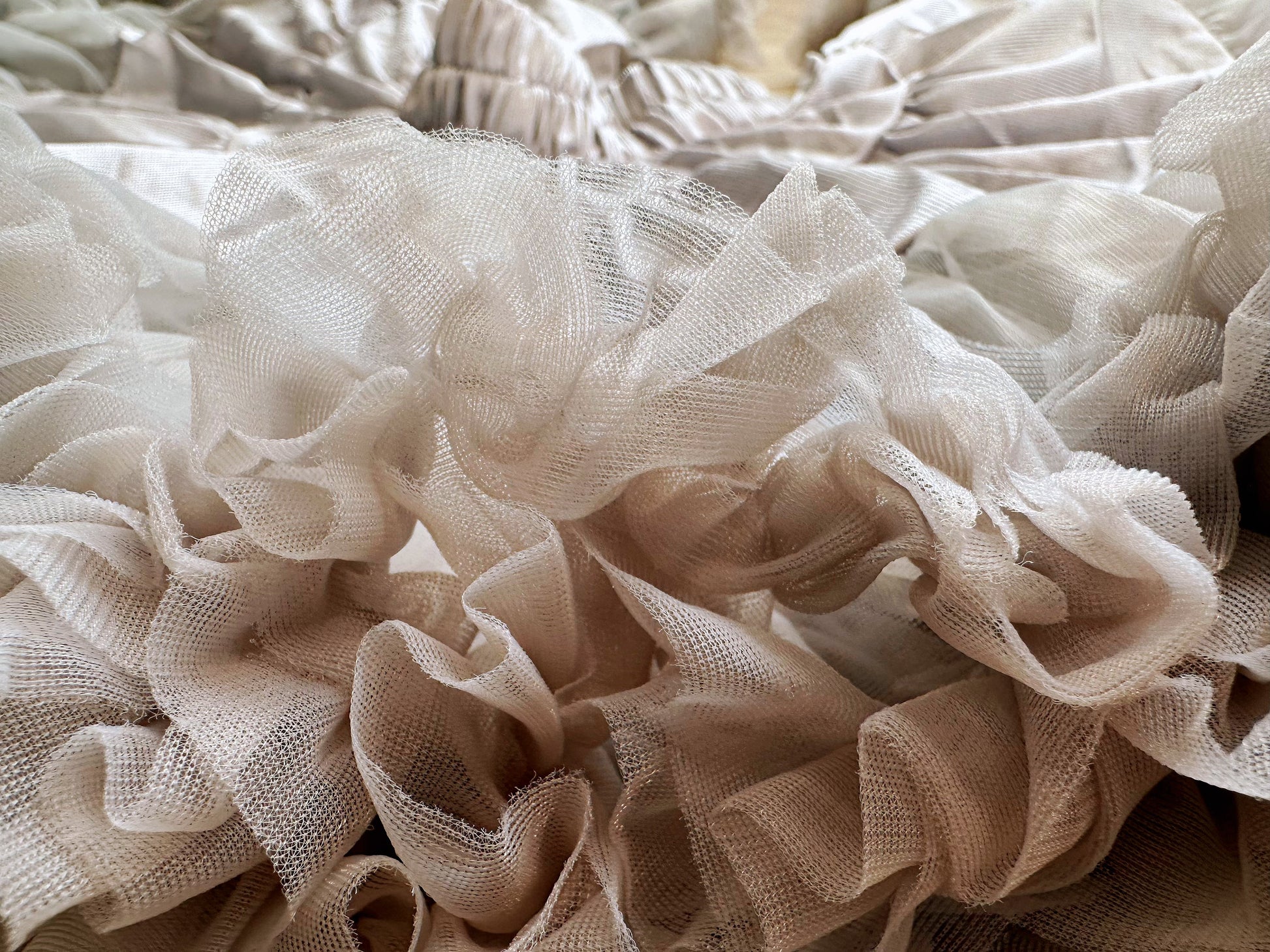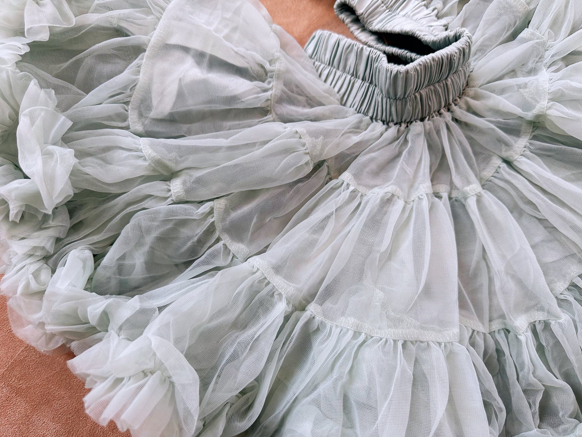 The fabric is anti-wrinkle, after you get the goods, Pls kindly hang for a while and it will resume to fluffy and flat soon. Many thanks. The skirt was made via 2 layers of tulle and 1 layer of lining. The fabric of the skirt is nylon which is soft and fluffy.
